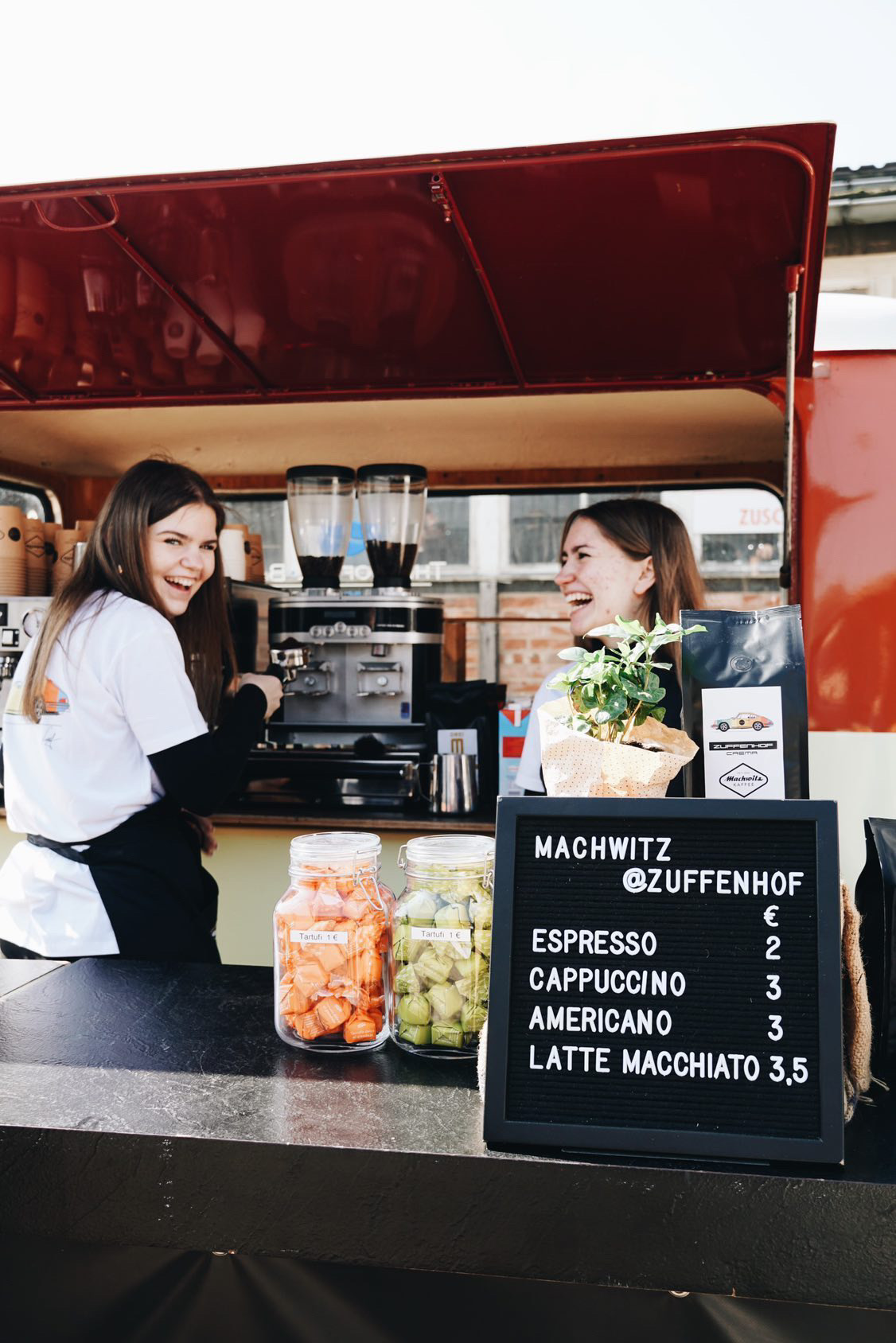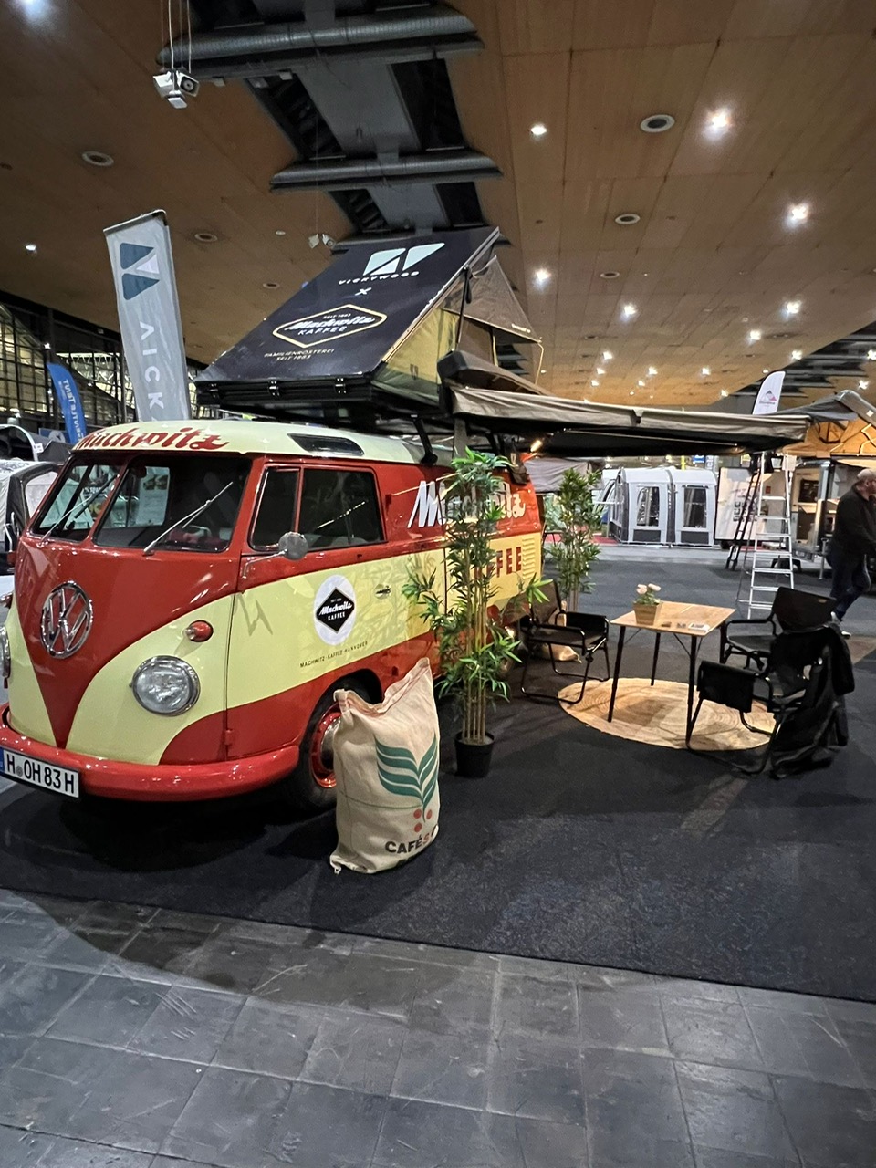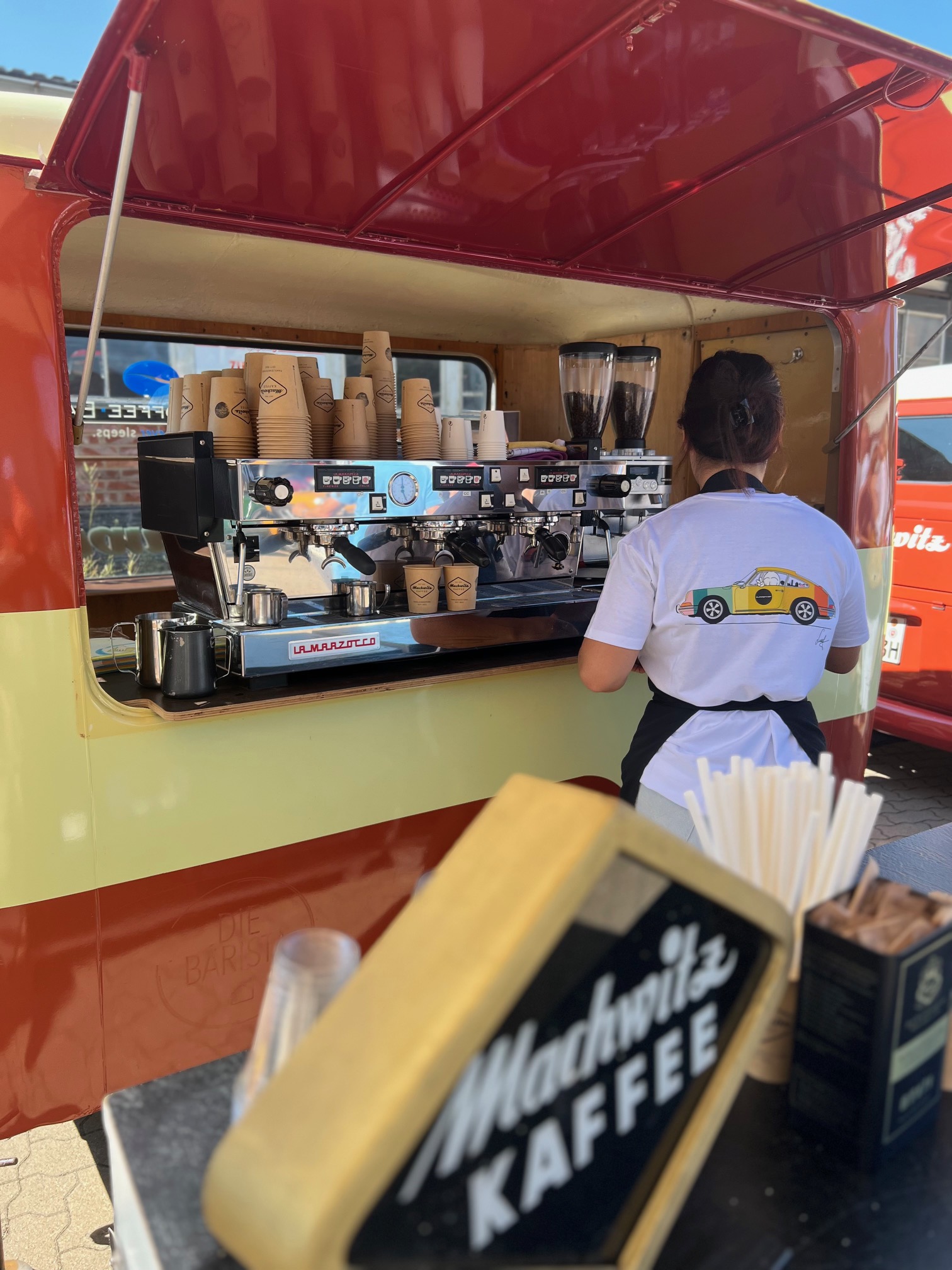 Der Machwitz Bulli ist häufig als Kaffeemobil unterwegs und kann auch für Veranstaltungen gebucht werden. Mittlerweile gehört zum Bulli auch noch ein Westfalia Verkaufsangänger von 1953, der ebefalls als Kaffeewagen genutzt wird.