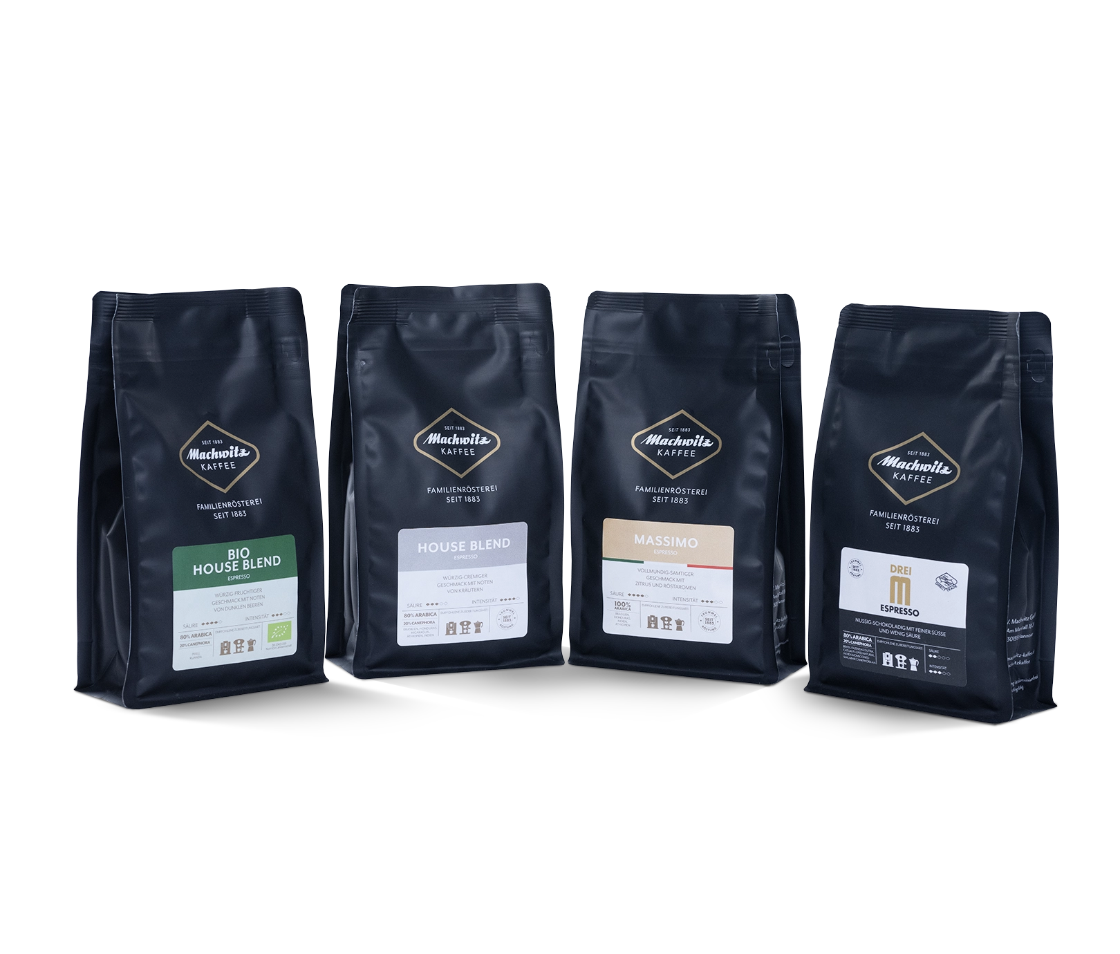 • 4 verschiedene Espresso-Röstungen (Bio House Blend Espresso, House Blend Espresso, Massimo Espresso, DreiM Espresso)